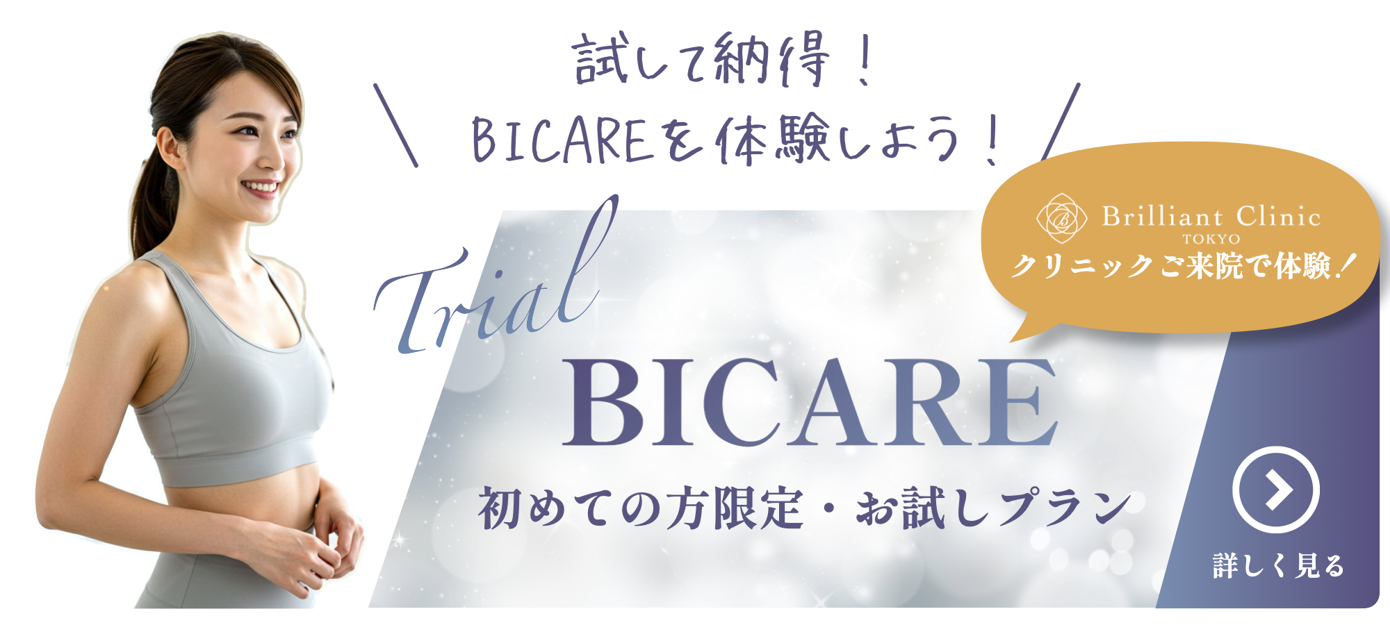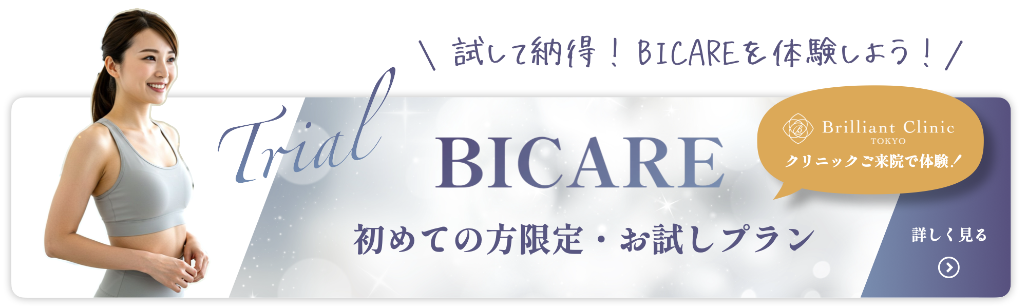BICAREボディメイクプログラムのご契約期間は1か月単位となっており、また、サービス利用開始日から2か月間はご継続が必要です。なお、中途解約は承っておりません。『レンタル契約の前に、使用感を試したい』という方は、ぜひ当院(Brilliant Clinic Tokyo/神保町徒歩3分)にてお試し体験をご利用ください。詳細は当サイト内でご案内しております。