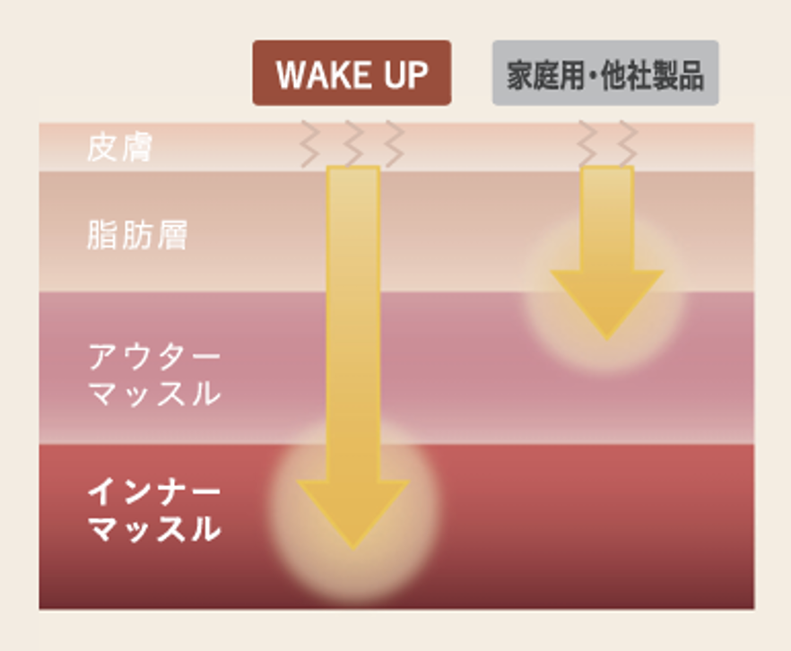 BICAREボディメイクプログラムに使用するEMSは、世界最高峰の筋刺激を目指して設計された「WAKE UP」。特許出願中の独自の波形技術を採用し、深部の筋肉(インナーマッスル)にも刺激が届くよう工夫されています。
