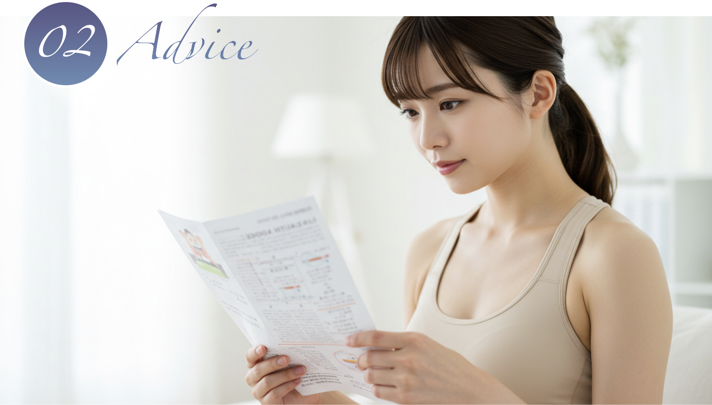 BICARE各プログラムご利用の方には、初回の機器発送時にBICARE式Wellness Guideを同封します。当院院長からのアドバイスが満載!読みやすく、実践しやすい内容で、初めての方でも安心して取り組んでいただけます。ぜひ、BICAREと一緒にこのガイドもご活用いただき、より健やかな毎日への一歩を踏み出してください。