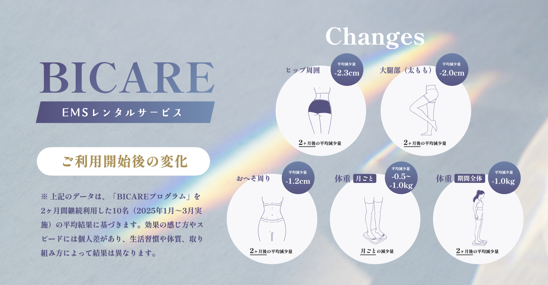 ピラティスもジムも、SNSで話題の痩⾝サプリも試したけど、全部続かなくて…。「もう無理かも」って思ってた時にBICAREに出会いました。内科医監修の安⼼感もあって、「これがラストチャンスかも!」と申し込んだら⼤正解!⾷事改善も含めて取り組んだところ、ただ痩せるだけじゃなく、体の内側から引き締まってきて感動してます。
