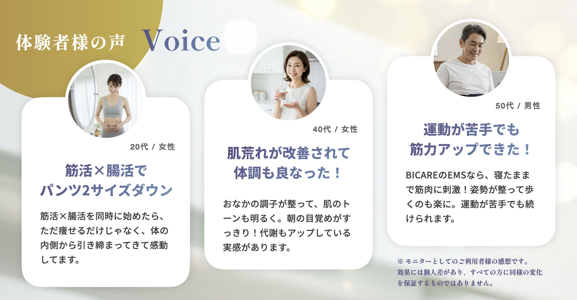 運動が⼤切なのはわかってるけど、ジムに⾏く時間もないし、運動が苦⼿で… そんなときに出会ったのがBICAREプランのEMS。最初は半信半疑でしたが、寝たままで筋⾁にしっかり刺激が⼊るのを実感! 徐々に姿勢が良くなり、歩くのも楽になった気がします。無理なく続けられるので、これからも続けていきたいです!